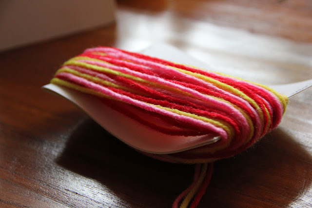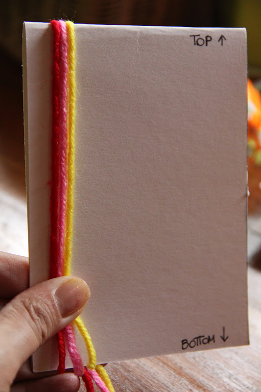 Now we can collect the 3 different yarns, that will be wrapped loosely (this is important to remember, because you can avoid the "bungee jumping" effect on your tassel, after cutting it free fom the cardboard!!!) around the cardboard. You can start from the front of the cardboard to the back of it