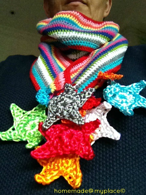 What a mess with all these tails to trim, both from the scarf and all the stars....