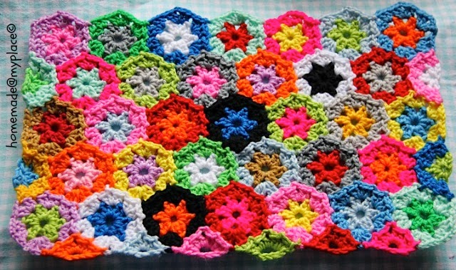 I made 33 hexagons, working with a 5mm hook and indonesian acrylic yarn.