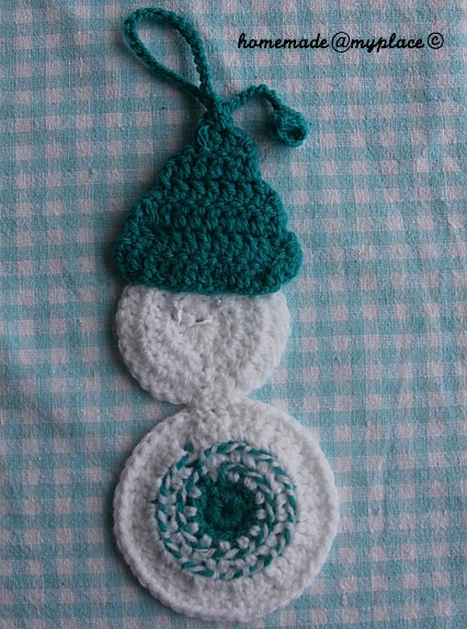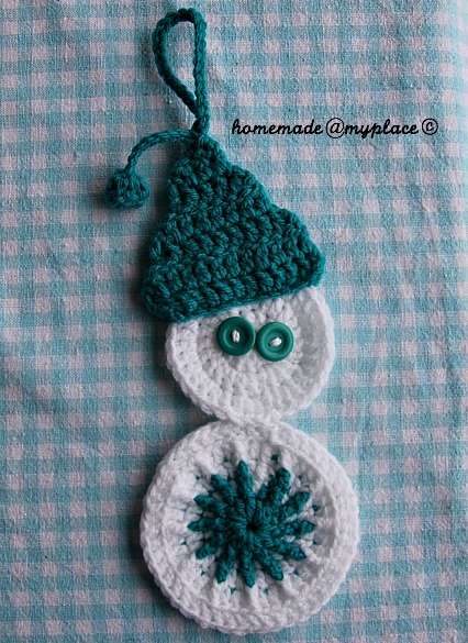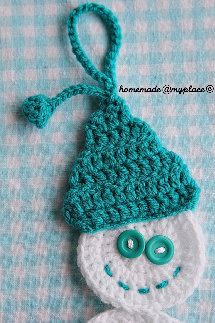 I invite you to follow my photo tutorial of Saint Nick ornaments, where I explain how to crochet Saint Nick's face. You follow the same steps even for the Snowman! Choose the 3 stitches of the body between any couple of FPdcs !