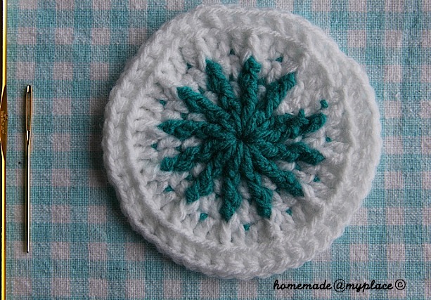 ROUND 3 : after the slip stitch to close the round, overlap teal over white, overlap white over teal, chain 2 and crochet 1 double crochet. Overlap teal, overlap white and make a double crochet in next stitch, overlap teal and crochet your first FPdc. Overlap white and crochet a double crochet in next stitch. Anyway, follow the given pattern!
