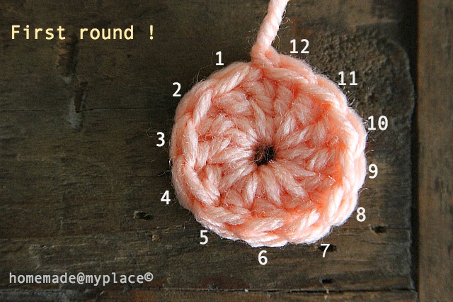 First round : chain 2, crochet 12 DCs into the ring, then slip stitch in the top of the first DC. Now you can pull the yarn tail of the beginning to reduce the hole of the ring and cut the excess of yarn.