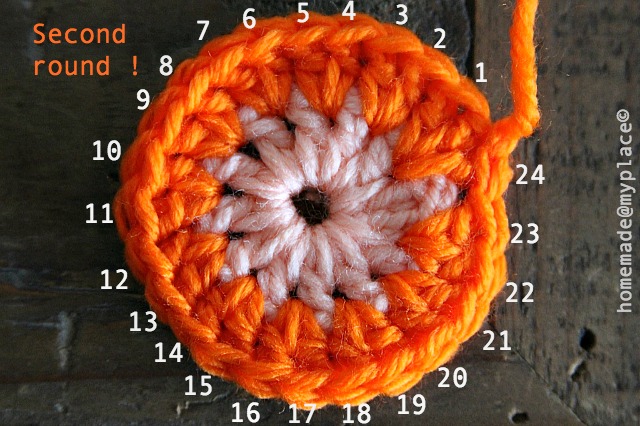 Second round : choose a new colour. Push your hook in any space between 2 DCs and pull to the front the new yarn (you'll have a loop) and hook again the yarn above the top of the circle and pass it through the loop : yarn joined! Chain 2 and crochet 2 DCs in the same space. You need to crochet 2 DCS in each next space, so that at the end of the round you'll have a total of 24 stitches. Slip stitch in the top of the first DC made, cut yarn, fasten off and trim in ends.