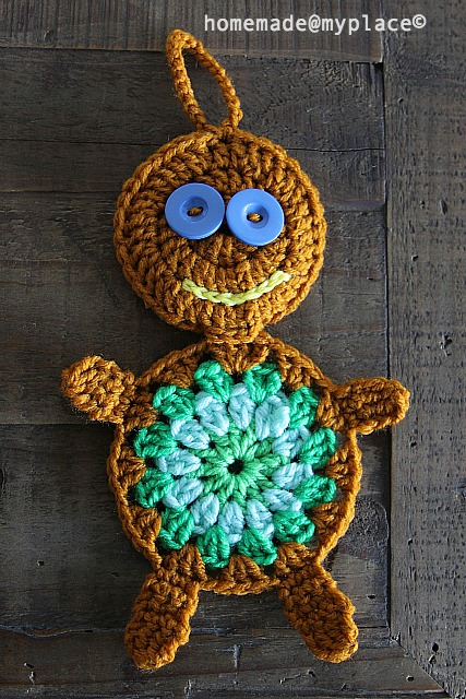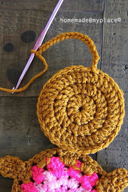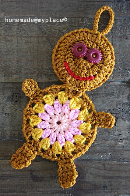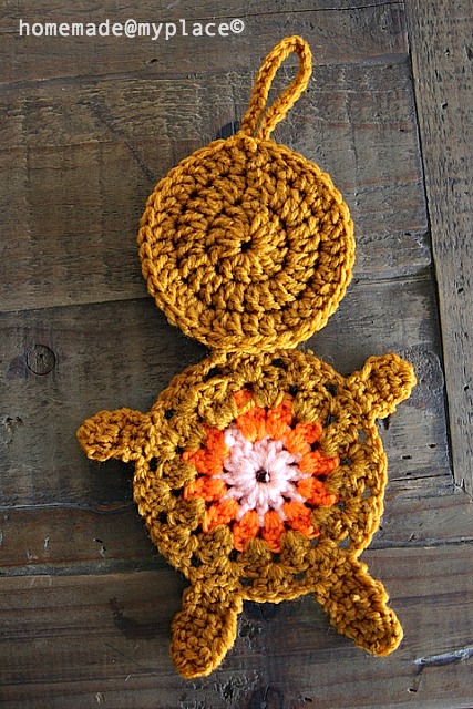 You have the gingerbread man's face still on the hook and you need to crochet the last 3 DCS to complete it … and while completing the 3 DCs, you will even join the face to the body (so no sewing required!) . How ?