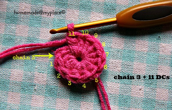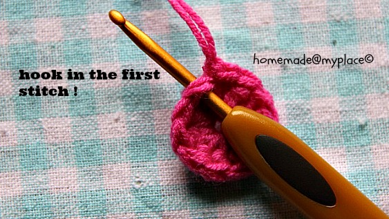 close this first round with a slip stitch in the top of the first stitch (the chain made with 3 chains)