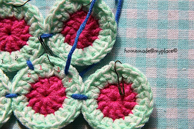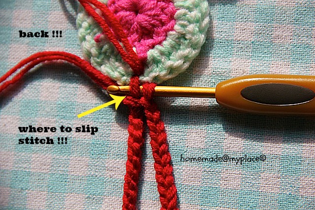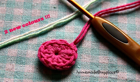As I don't change the yarn colour at the end of each round, "my pattern" is slightly different from the original one…. In fact, when I finish a round (completed after a slip stitch), I crochet 2 more slip stitches in the top of the second and third stitch of the shell, so that I reach the chain-1 space, where I crochet one more slip stitch and where I chain 2 or 3 as requested by the pattern!