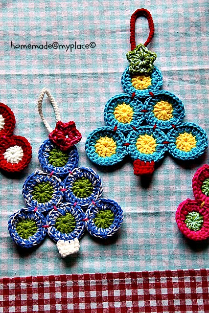 I joined the 3 pieces together with some single crochets, then I added a tassel (here, but not chunky!) and a chain in contrasting colour, helpful to hang your decoration anywhere!!!