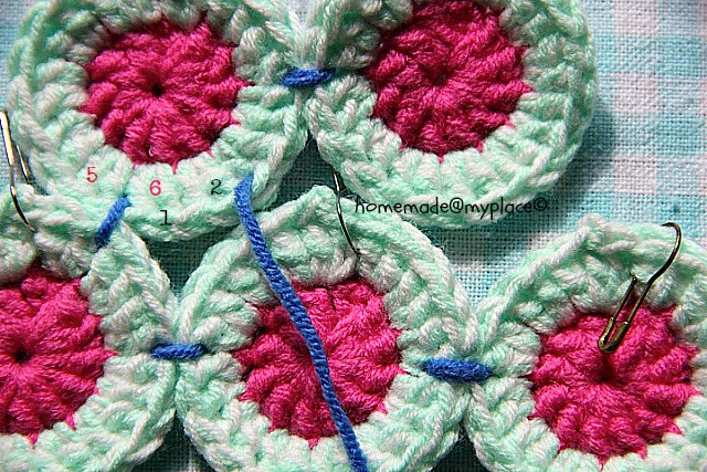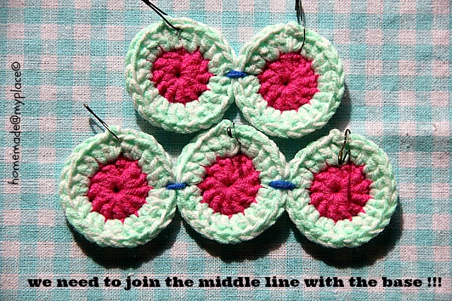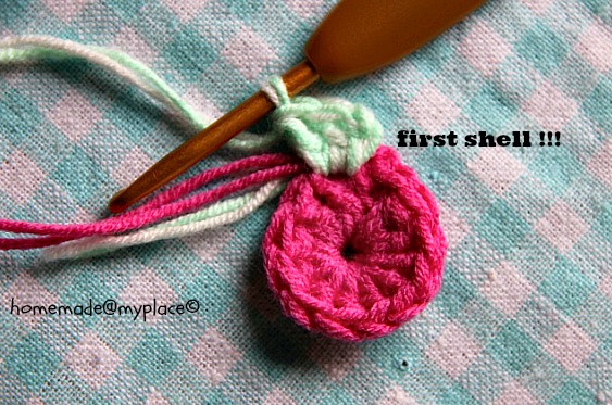 This same thread has to go up to the above circle (the first on the left of the middle row) and make it pass between the 5th and the 6th shell (anti-clockwise counting from the stitch marker)