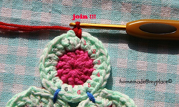 Pass the thread in the right disc of the base row, in the space between the first and the second shells (counting anti-clockwise from the stitch marker)