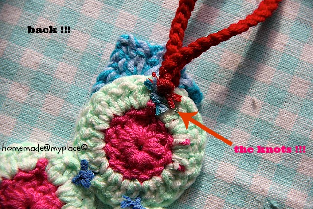 Even now, remember to pass the thread twice and knot it in the back. Cut the excess of yarn and fix the knot with some clear nail polish!!! Do the same for the following knots, all of them!!!!