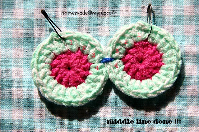 1st thread : starting from the circle on the left (middle row), insert the thread in the space after the first shell (counting clockwise from the stitch marker)