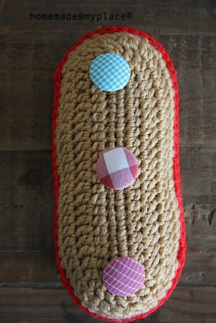 Once the buttons are sewn on, collect the other body piece, some colourful yarn for the "icing", a hook and some toy stuffing!