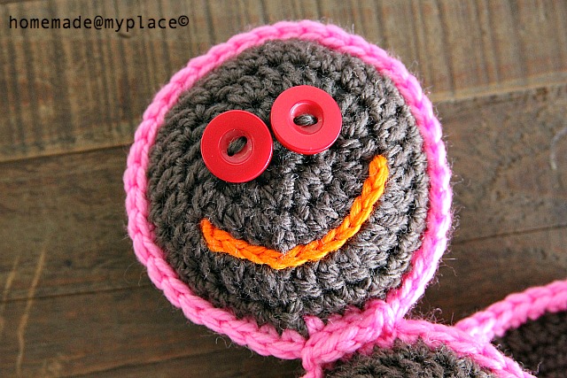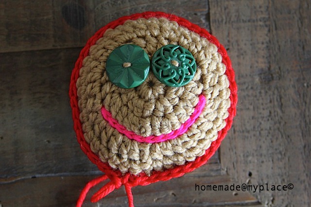 The smile is obtained with the help of some slip stitches (12!), a hook and some bright yarn! It's the same thing I did for my Gingerbread man Ornament !