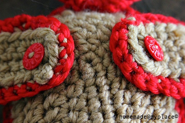 To join the two circles together (front and back), I did the same as for the body parts, using the hook and the "icing" yarn to crochet a round of SCs, starting from the lower part of the head-to-be . I started from the bottom and I worked around, from right to left side, until I reached the eyes position. Through the opening, I put inside some stuffing and when happy with the filling, I completed the round of SCS. As for the body, I slip stitched in the top of the first SC, but WAIT BEFORE TO CUT THE YARN!